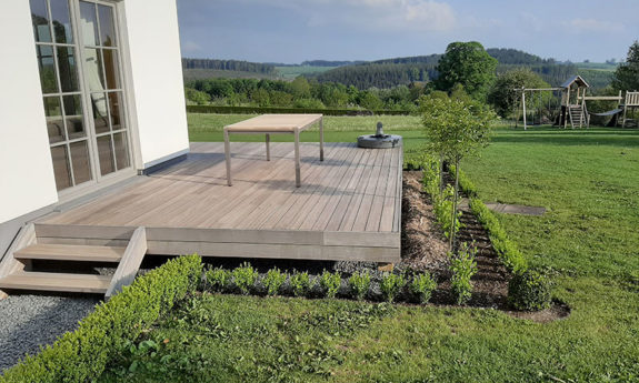 Terrasse sur pilotis (plancher en padouk 22/110, fixation invisible B-fix ; structure et pergola en douglas autoclavé)